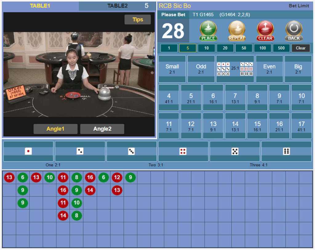 ((RCB SICBO))ជាប្រភេទហ្គេមដែលមានគ្រាប់ឡុកឡាក់3គ្រាប់ លទ្ធផលបានដោយការក្រឡុកគ្រាប់ទាំងបី ហើយមាន5ជំរើសក្នុងការភ្នាល់គឺ BIG/SMALL/ODD/EVEN/SINGLE BET ករណីលទ្ធផលចេញTRIPLE គឺ BIG/SMALL/ODD/EVEN
